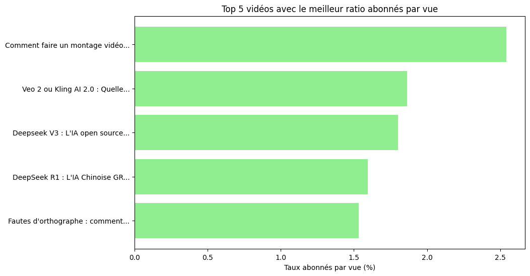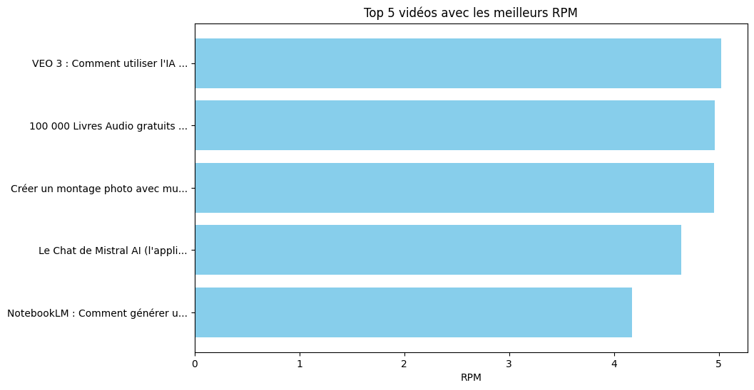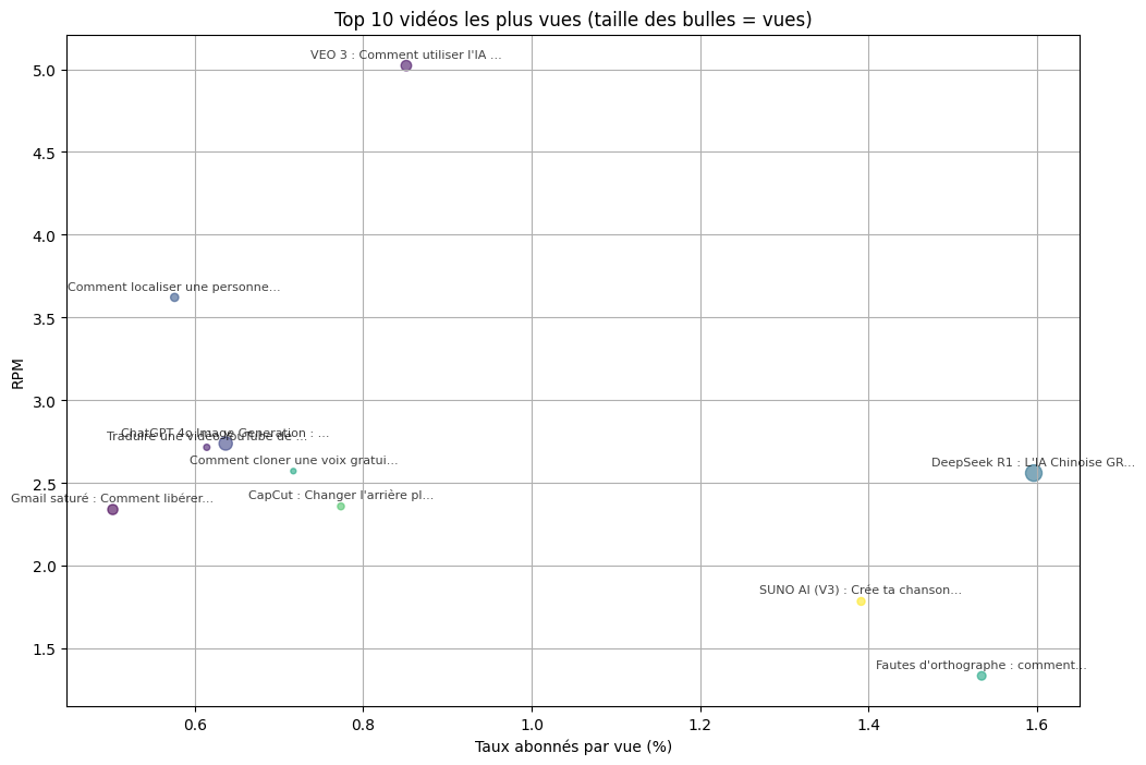 Pendant le podcast, j’ai donné mon propre exemple : « Je lui ai demandé de me sortir les vidéos de ma chaîne YouTube qui avaient généré le plus d’abonnés par vue et les meilleurs RPM (revenus pour 100 vues) ».