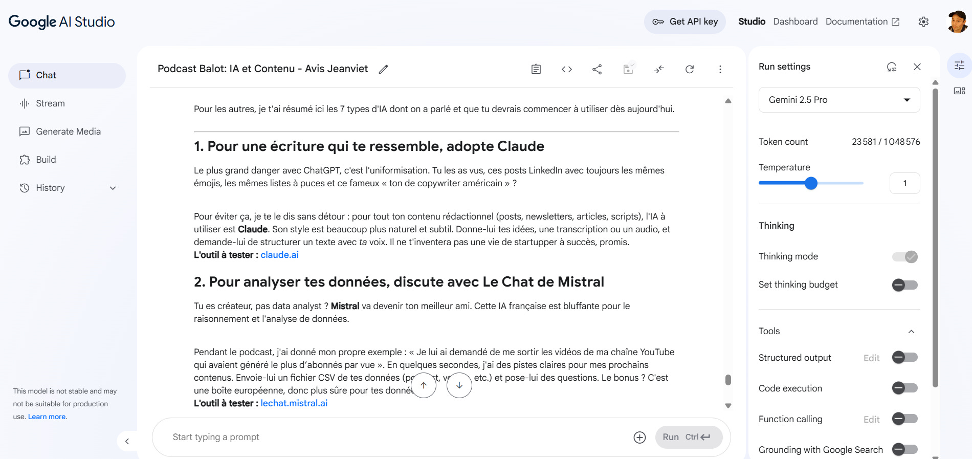 Tu peux y accéder soit en utilisant Notebook LM, Gemini ou AI Studio. Moi je préfère AI Studio, car c’est sans limites, et on peut choisir le modèle le plus avancé de Google (Gemini 2.5 Pro) sans payer.
