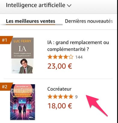 Grâce à tous ces efforts positifs et coordonnés, le livre a été pendant 1 bon mois dans le top 3 des livres les plus vendus sur Amazon dans la catégorie IA, juste derrière Luc Ferry et Harari. Et même n°2 le 28 mars !