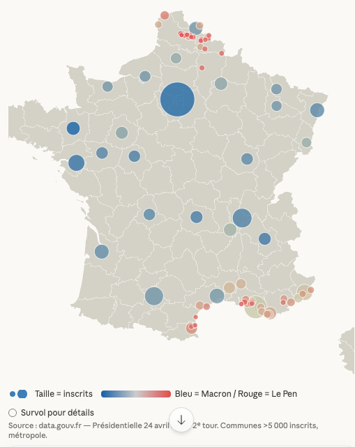 Les résultats des élections 2022 → Les villes qui votaient le plus Macron ou Le Pen au deuxième tour, avec des visualisations interactives.
