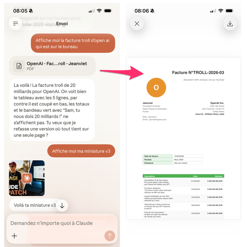 Le cas d’usage typique : tu es dans le train, au bureau, sur la plage. Tu veux accéder à un fichier sur ton Mac resté à la maison. Tu tapes ta demande sur l’app Claude de ton iPhone, et Claude s’en occupe.