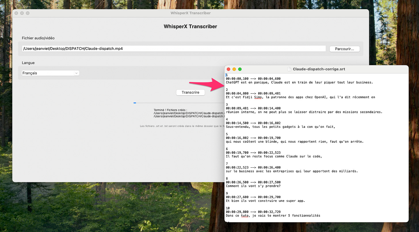 Mon exemple concret : j’ai demandé à Claude Code de me créer une appli de transcription avec Whisper X. C’est cette appli que j’utilise pour transformer l’audio de mes vidéos YouTube en texte. Ensuite, je donne cette transcription à Cowork qui me crée des articles, des posts LinkedIn, des notes Substack.