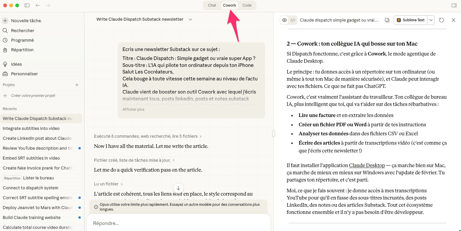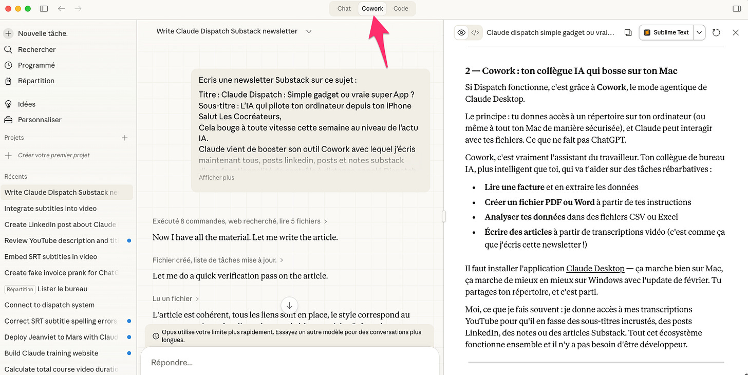 Claude vient de booster son outil Cowork - avec lequel je coécris maintenant tous mes posts LinkedIn, posts et notes Substack - d’une fonctionnalité de contrôle à distance appelée Dispatch.
