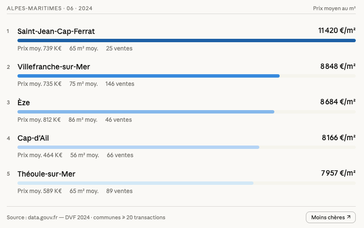 “Quelles sont les 5 villes du 06 les plus chères au mètre carré ?” → Claude a téléchargé les datasets, nettoyé les données, croisé les bases, vérifié les codes INSEE via l’API Geo. Résultat :