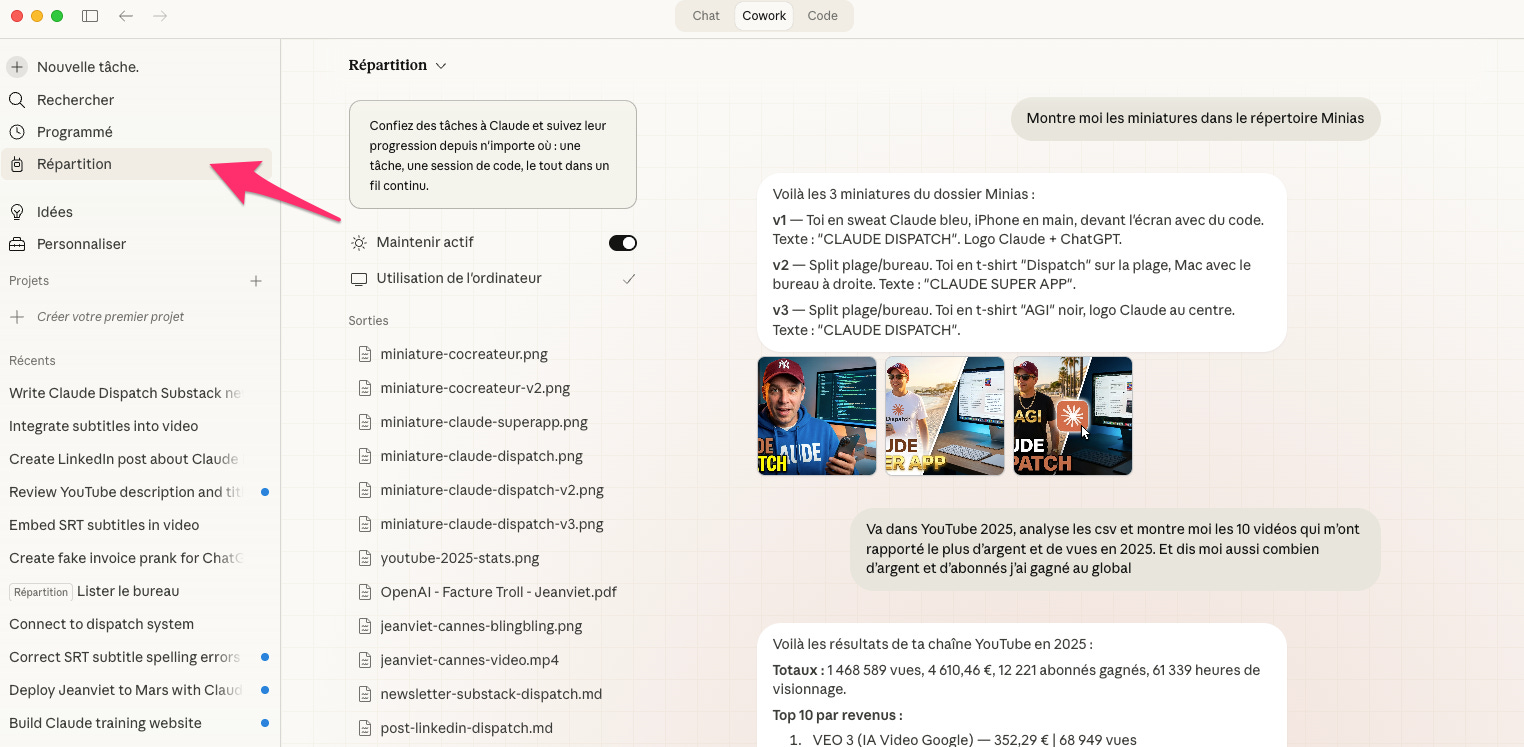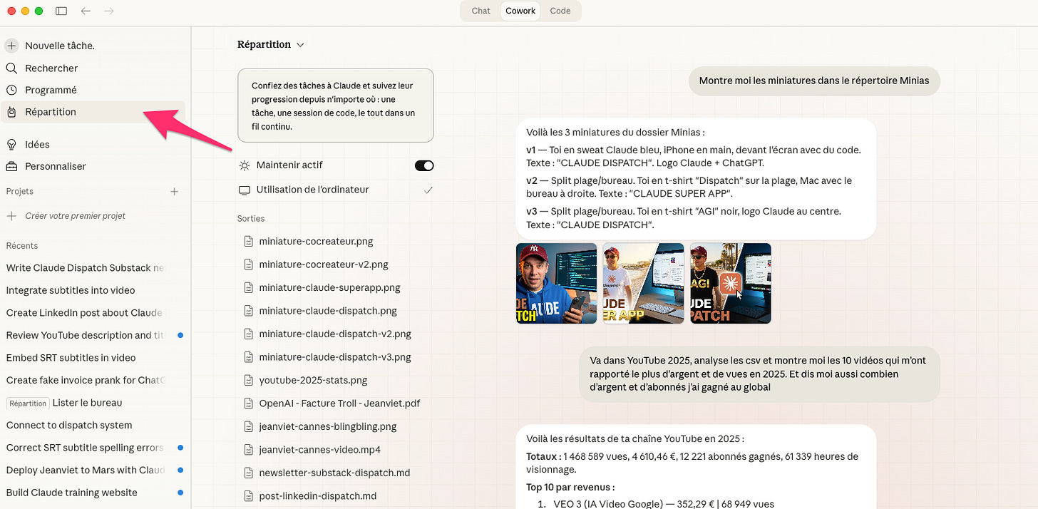 Pour le mettre en route, c’est très simple. Tu ouvres Claude Desktop, tu vas dans l’onglet Cowork, tu cliques sur Dispatch (renommé “Répartition” dans l’interface Desktop, et “Envoi” sur l’appli iPhone), tu l’actives et voilà.