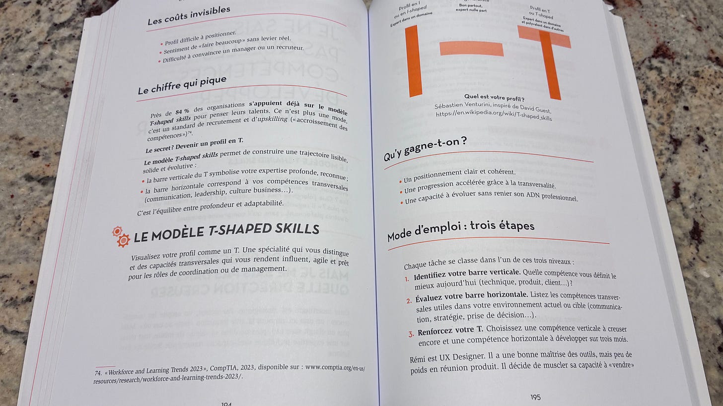 Sébastien parle dans la partie “évolution de carrière” du profil “T-shape” : une spécialité forte (la barre verticale du T) combinée à des compétences transverses (la barre horizontale).
