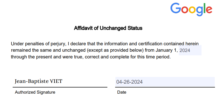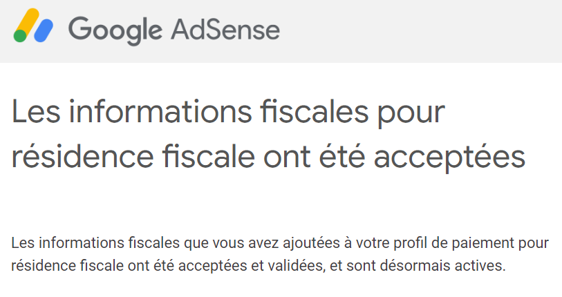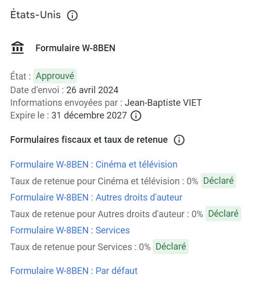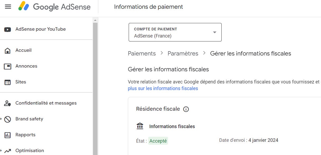 De mon cÎté, les formulaires sont à jour pour Google AdSense (pub sur mon blog) et pour AdSense pour YouTube (pub sur mes vidéos YouTube) pour :
