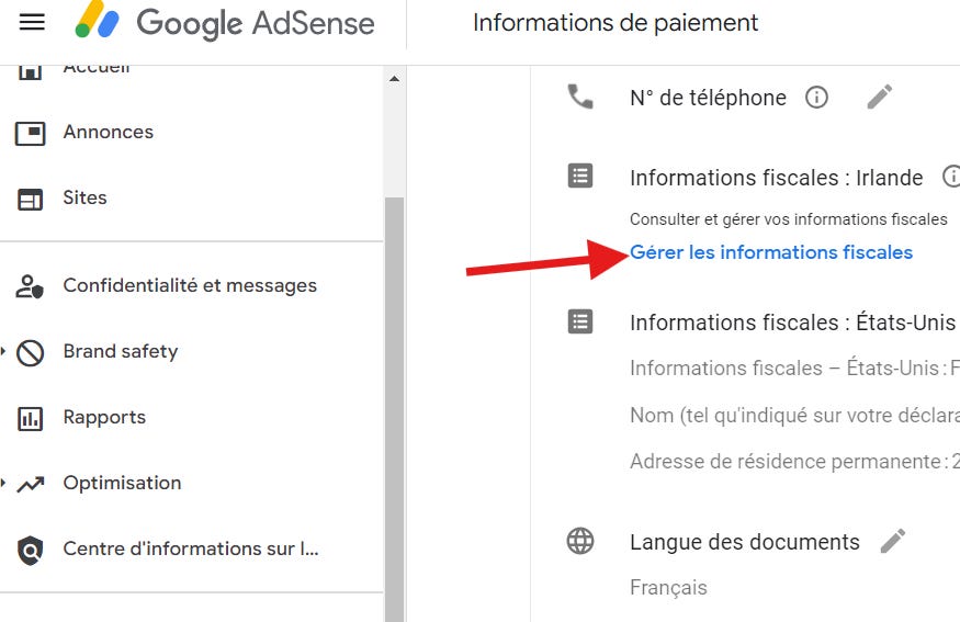 Pour faire cette dĂ©marche, Google AdSense ne nous facilite vraiment pas les choses au niveau du parcours ! A croire quâils font tout pour quâon se plante et quâon verse 24% de nos revenus mondiaux Ă leur mĂšre patrie amĂ©ricaine.