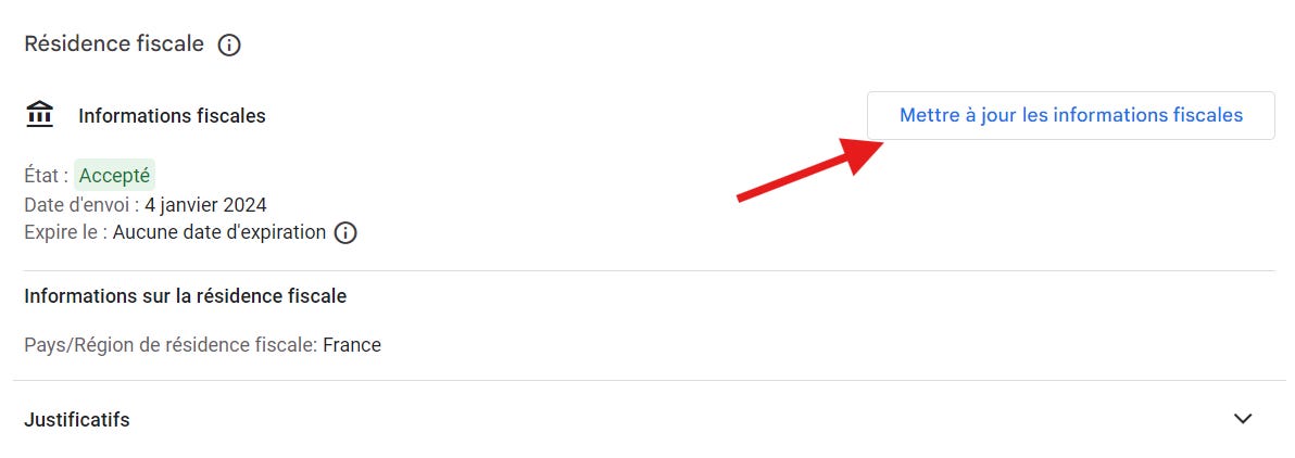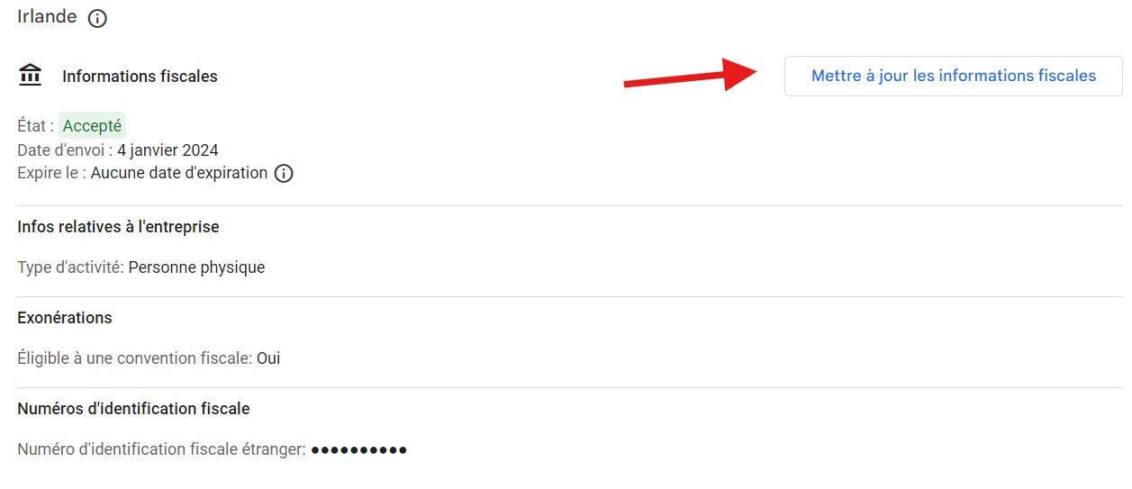 Sur cette page, vous devez encore scroller en bas et mettre Ă jour vos informations fiscales si vous nâĂȘtes pas Ă lâĂ©tat âAcceptĂ©â.