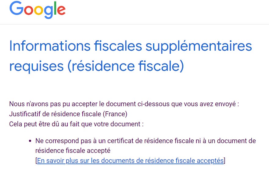 En cliquant sur leur lien âdocuments de rĂ©sidence fiscale acceptĂ©sâ, câĂ©tait encore plus incomprĂ©hensible.