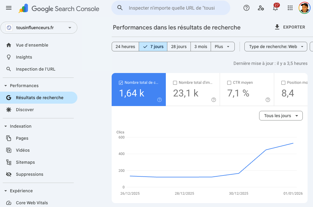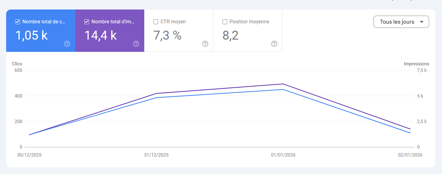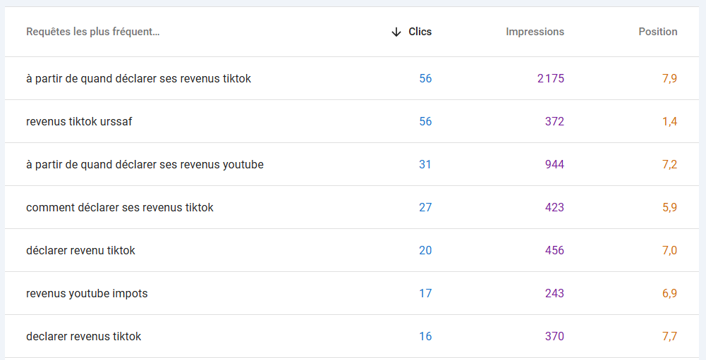 Avec près de 15 000 vues cumulées !!! En regardant mon trafic dans Search Console, j’ai vu émerger depuis quelques mois des recherches autour de la déclaration de revenus TikTok qui menaient vers mon article : « Comment déclarer ses impôts quand on est influenceur ? »