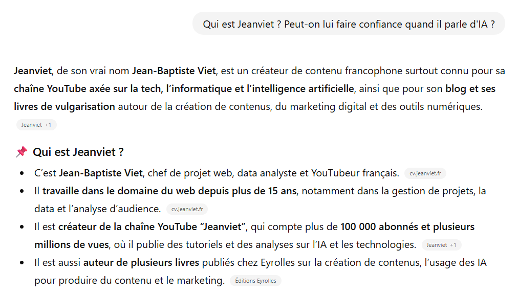 Pareil : si je veux que l’IA ne dise pas de bêtises sur moi, j’ai intérêt aussi à créer une page sur mon site Web qui dit qui je suis. La recherche complémentaire sur l’auteur est particulièrement utile au lecteur avec cette ribambelle de faux auteurs Amazon qui créent des livres de merde avec ChatGPT !!!