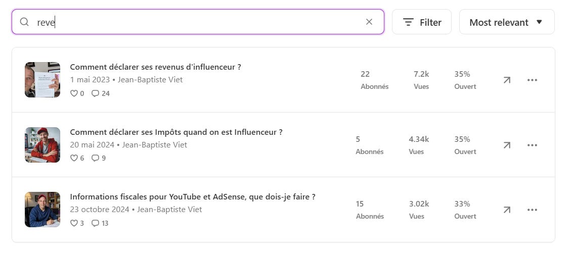 En créant des articles Substack sur votre sujet d’expertise, vous allez être rapidement visibles sur Google. Parmi mes 5 articles les plus populaires, j’ai 3 articles qui remontent sur la déclaration de revenus d’influenceur ;)