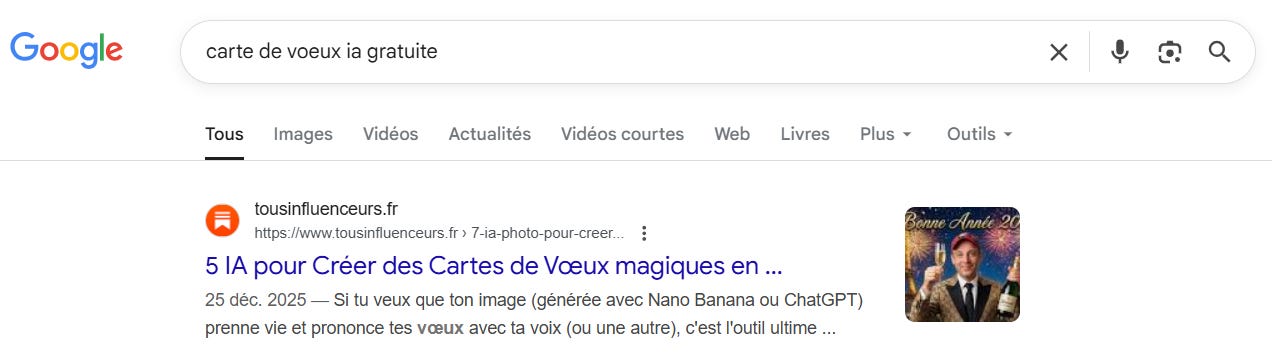 J’ai réussi la même mécanique sur Substack avec cet article écrit fin 2024 et totalement mis à jour fin 2025 : « Carte de vœux avec IA ».