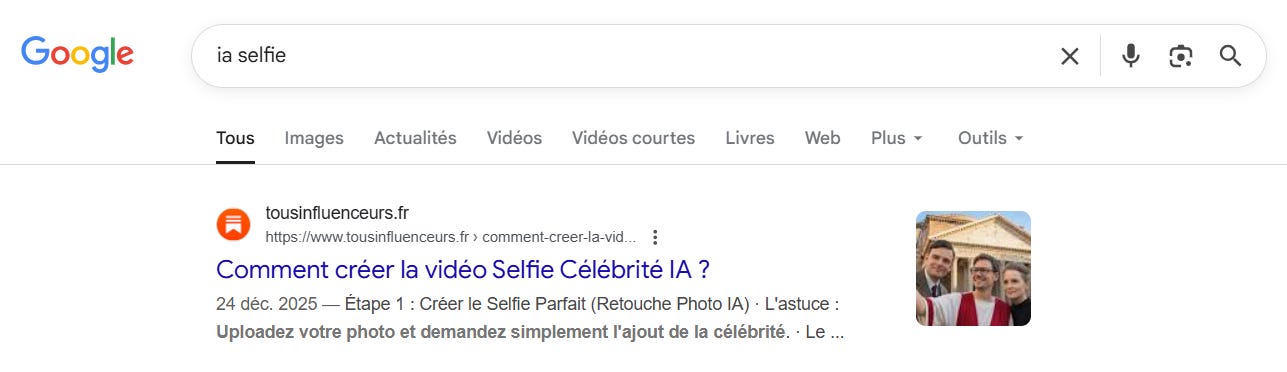 Sur ce Substack, j’ai réussi à surfer sur la tendance « Selfie Célébrité IA » qui m’a ramené 800 visites Google en quelques jours.
