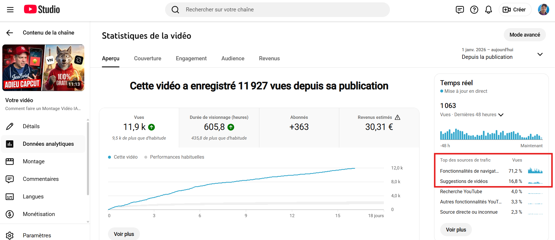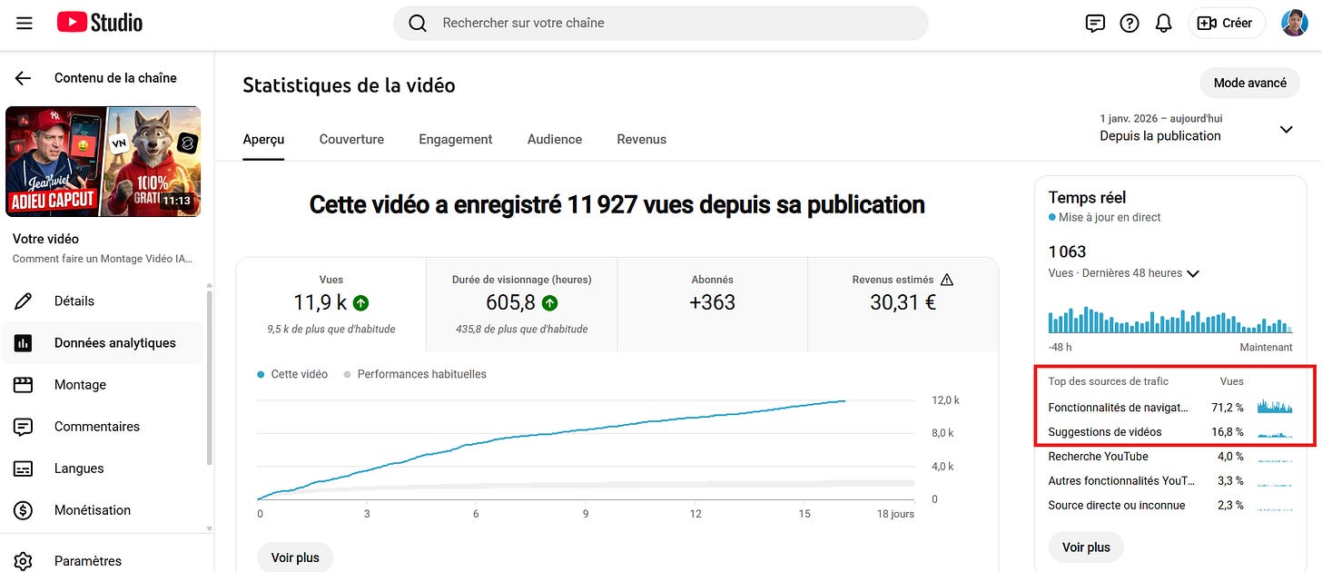 Vous aurez un petit boost au démarrage et une audience durable sur ce nouveau contenu si la qualité est au rendez-vous. Ici : 12 000 vues avec 1 000 vues/jour sur ma vidéo « Montage vidéo sur Smartphone sans CapCut ».