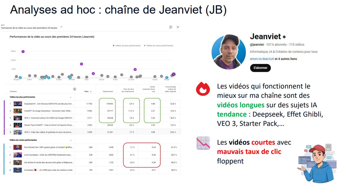 Ce qui m’a permis de générer en cumulé plus de 150 000 vues sur VEO 3, 40 000 vues sur Nano Banana, 30 000 vues sur Sora 2. Il faut que vous compreniez que même si j’avais eu 10 000 abonnés (au lieu de 100 000), j’aurais eu les mêmes résultats. Les abonnés ne nous appartiennent pas, c’est YouTube qui pousse les recos, pas nous !